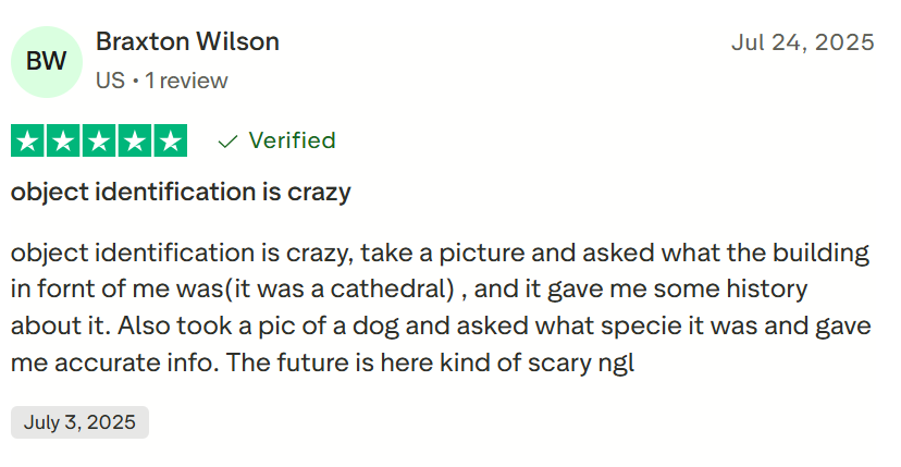 Real-time visual translation, object recognition, and instant ChatGPT interaction. "Instantly translates what you see.